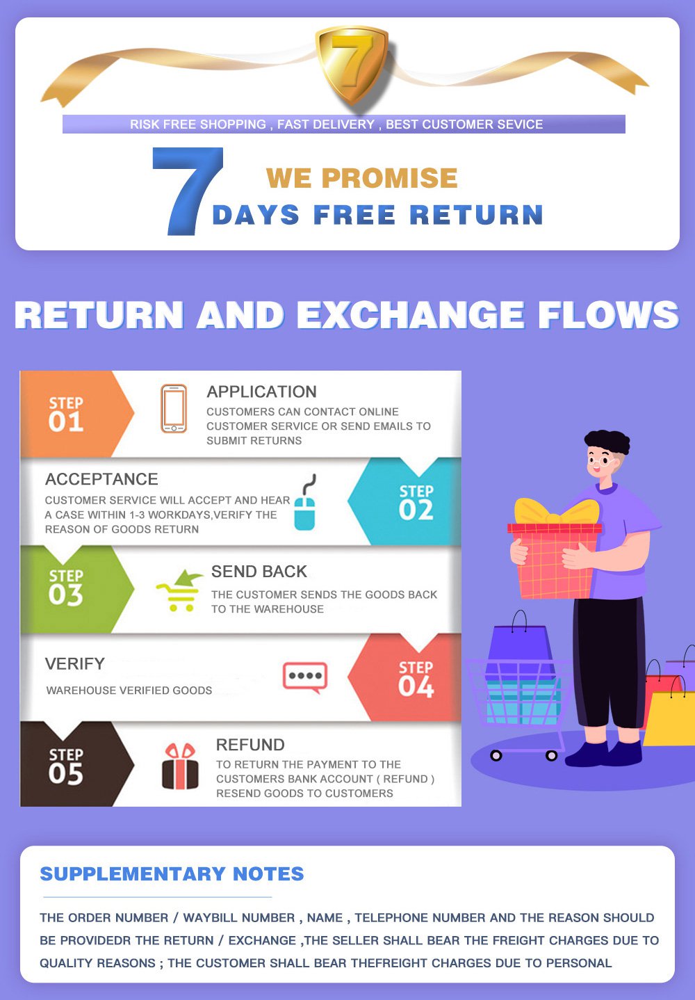 Quality assurance, 15-day returns and exchanges, worry-free returns and exchanges